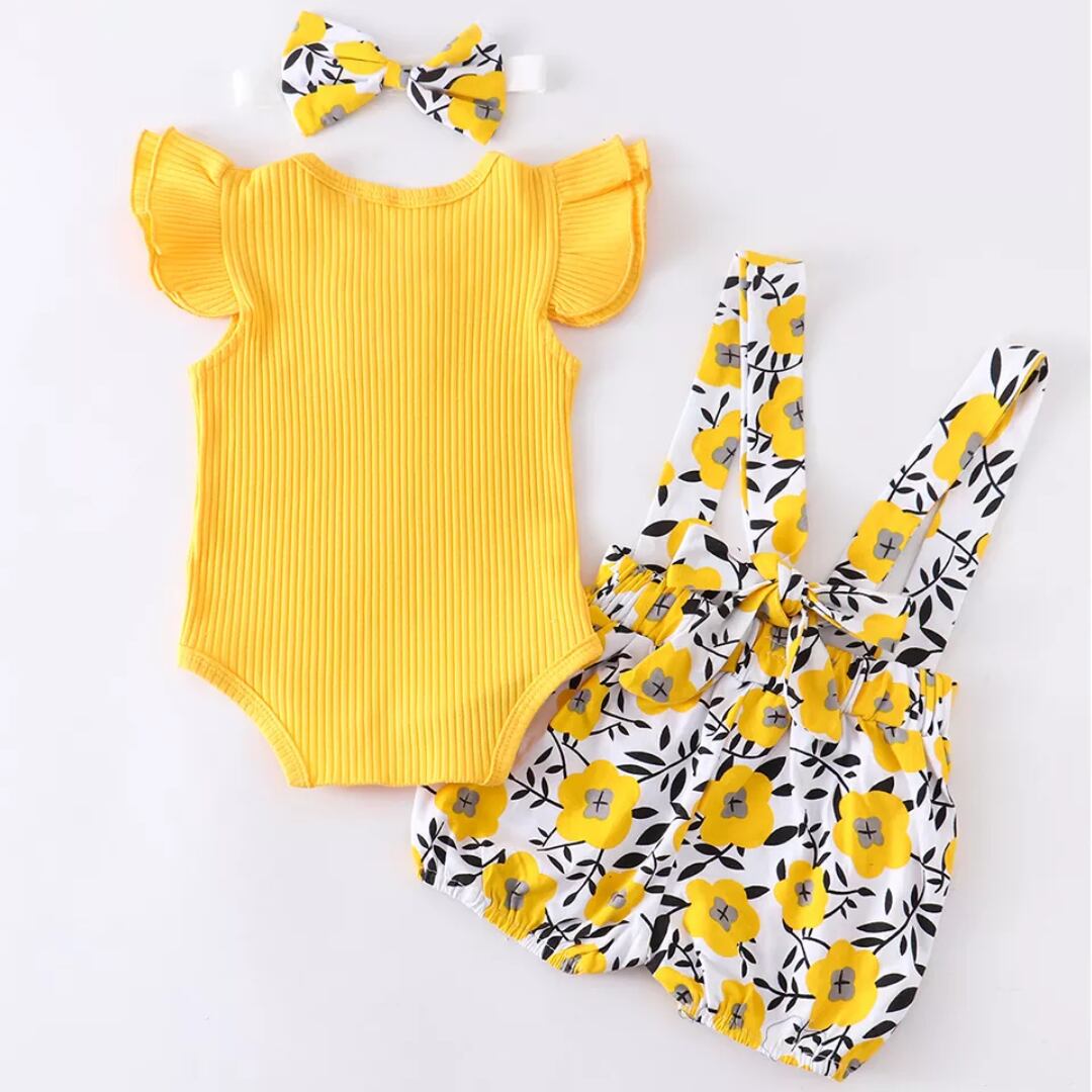 マリメッコ風サロペット&フリル袖ロンパースヘアーバンドリボン3点セット