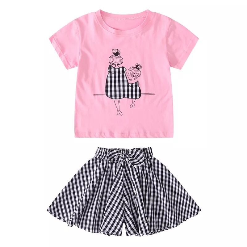 姉妹が描かれたロゴTシャツと黒白のチェック柄のスカートのセットアップ♡